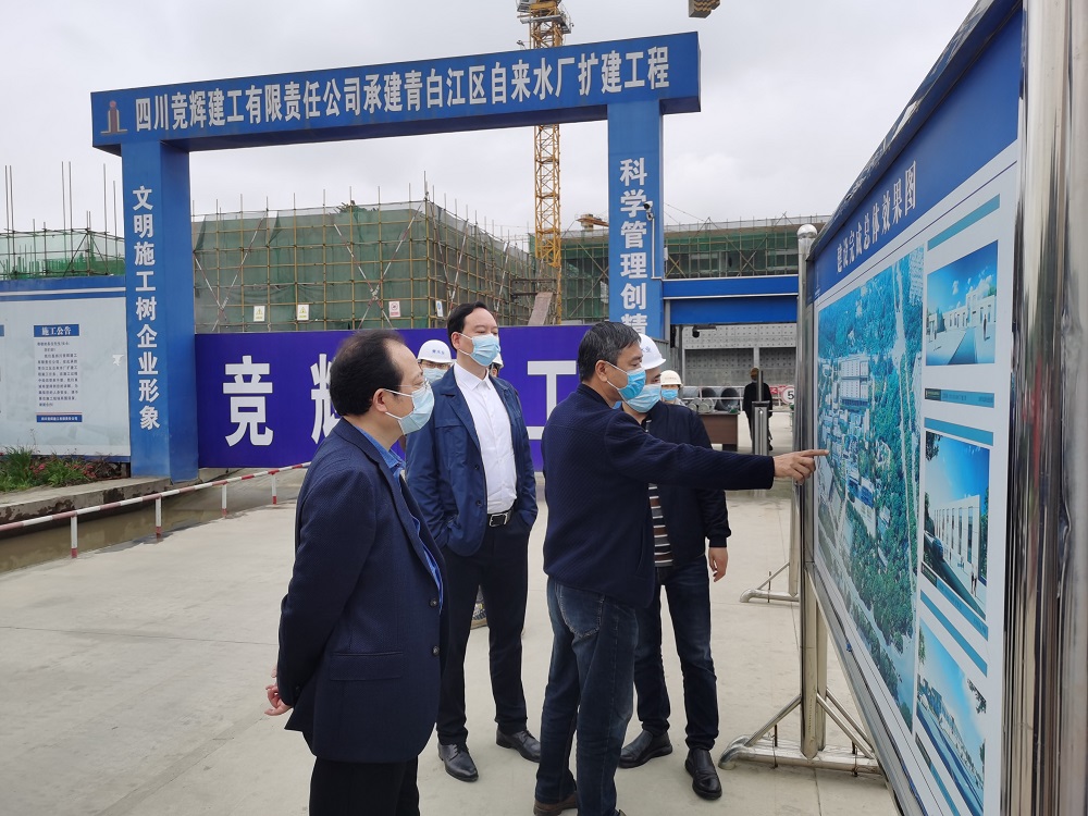 鐘杰董事長一行首先前往成都青白江水業(yè)股份有限公司,先后視察了該公司20T自來水廠擴建項目工地和現(xiàn)有自來水生產(chǎn)線,詳細詢問了工程規(guī)模、建設進度、質(zhì)量控制、安全生產(chǎn)等情況,聽取了成都青白江水業(yè)股份有限公司經(jīng)營班子工作匯報。
