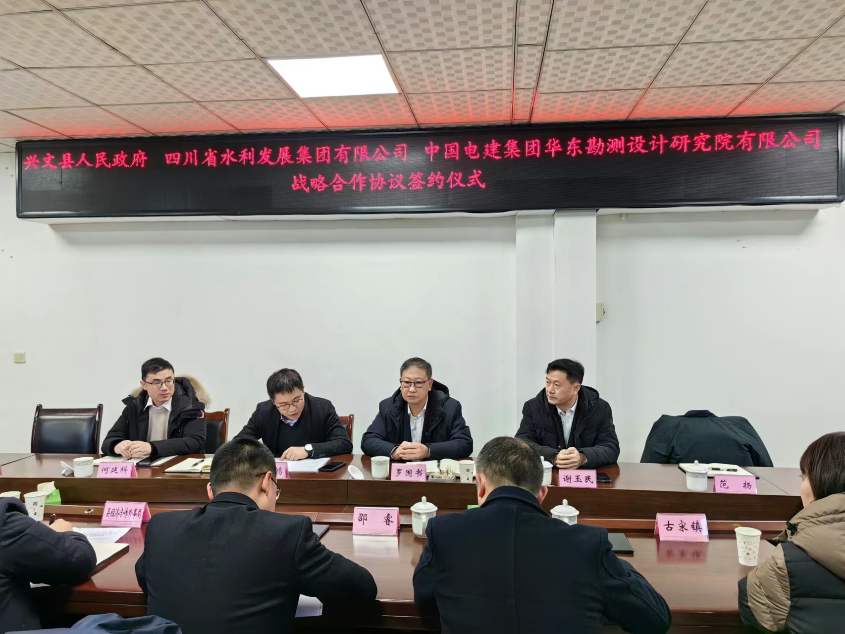 集團項目前期工作部負(fù)責(zé)人謝玉民、經(jīng)營管理部相關(guān)工作人員,興文縣領(lǐng)導(dǎo)江北春、戴林沖,中電建華東院西南區(qū)域總部何延科、郭榮利參加了簽約儀式。