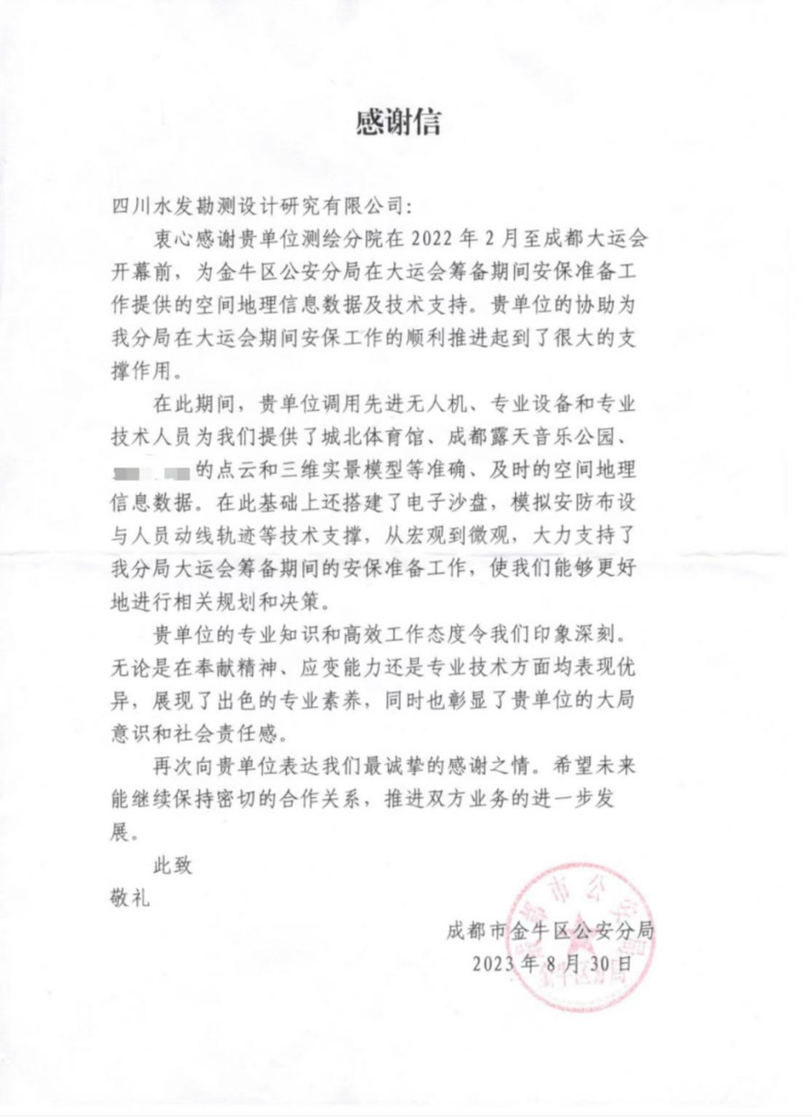 信中指出,設(shè)計(jì)公司測繪分院在大運(yùn)會籌備期間所展現(xiàn)出的專業(yè)知識和高效的工作態(tài)度令金牛區(qū)公安分局印象深刻,無論是在奉獻(xiàn)精神、應(yīng)變能力還是專業(yè)技術(shù)方面均表現(xiàn)優(yōu)異,展現(xiàn)了出色的專業(yè)素養(yǎng),同時(shí)也彰顯了設(shè)計(jì)公司的大局意識和社會責(zé)任感。