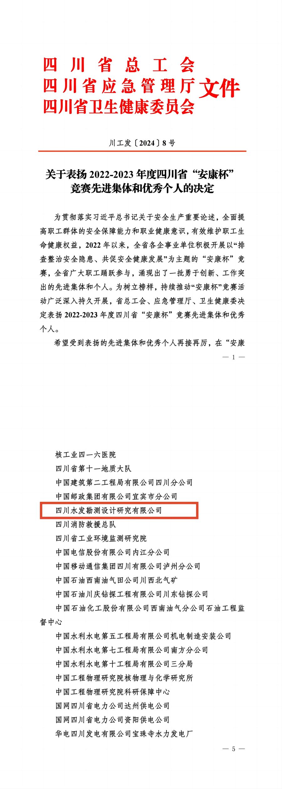 近日,四川省總工會、四川省應急管理廳、四川省衛(wèi)生健康委員會聯(lián)合表揚2022—2023年度四川省“安康杯”競賽先進集體和優(yōu)秀個人,設計公司獲得2022—2023年度四川省“安康杯”競賽先進集體。