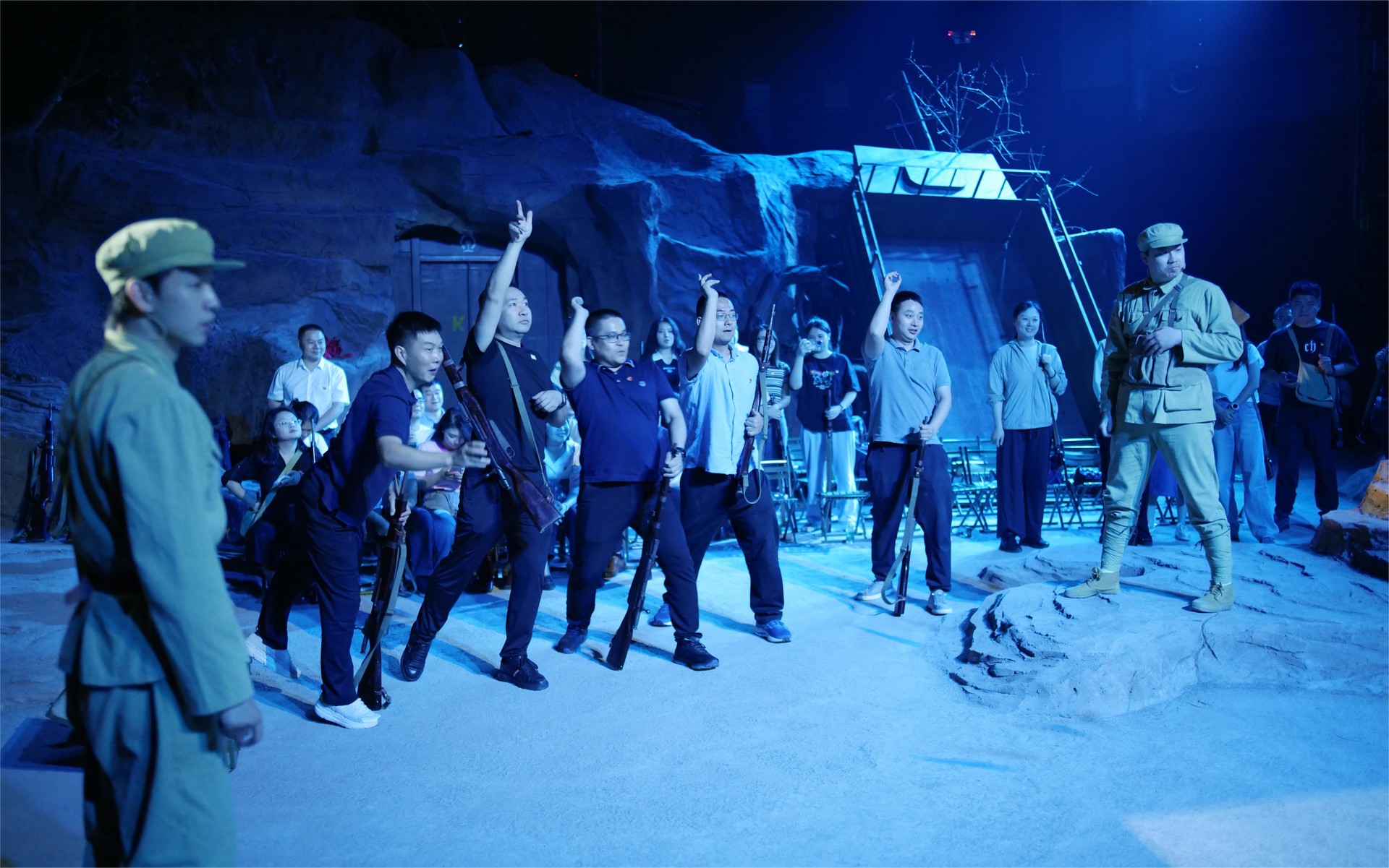 “同志們,你們準(zhǔn)備好了嗎?”“準(zhǔn)備好啦!”參觀完紅色文化長廊,大家整齊列隊進入沉浸式劇場,在充滿歷史感的環(huán)境中,駐足2024、回望1953。通過家鄉(xiāng)話別、寫家書、投擲手榴彈、坑道作戰(zhàn)、運送物資等環(huán)節(jié)沉浸式體驗硝煙彌漫的戰(zhàn)場,先輩們的英勇事跡在全息影像中得以生動還原,每一幀畫面都如同英雄的心跳,激發(fā)著黨員干部內(nèi)心的無尚崇敬和愛國主義情懷。在虛擬與現(xiàn)實交融的舞臺上,大家觸摸歷史的脈搏,集體莊重許下弘揚偉大抗美援朝精神建設(shè)四川水網(wǎng)的莊嚴承諾。