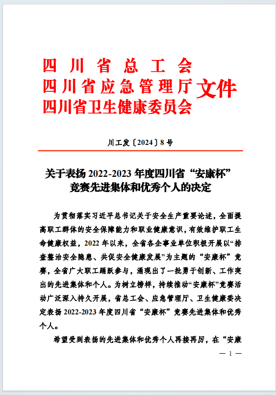 喜報(bào)!集團(tuán)榮獲2022-2023年度四川省“安康杯” 競(jìng)賽先進(jìn)集體和優(yōu)秀個(gè)人