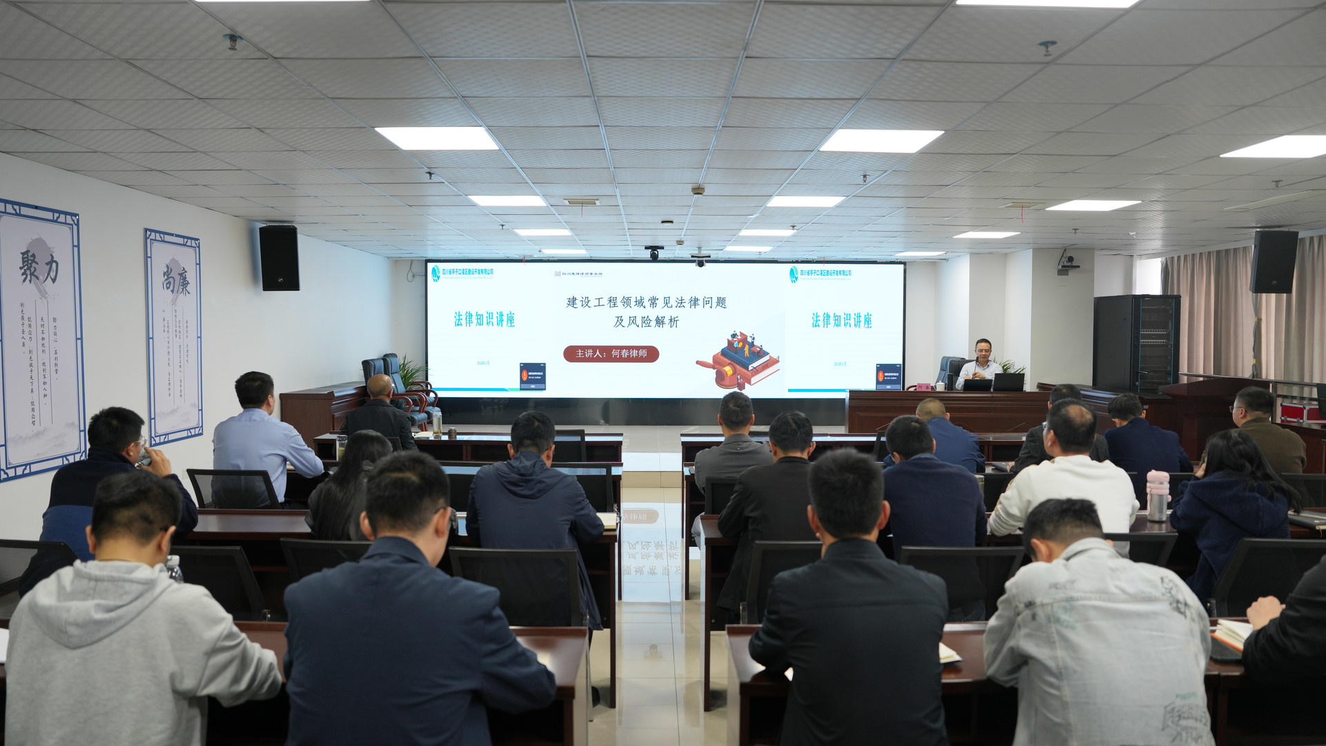 為提升干部職工對(duì)在建重大水利工程法律風(fēng)險(xiǎn)的認(rèn)知與防范能力,11月4日,亭子口公司組織開(kāi)展了建設(shè)工程領(lǐng)域法律風(fēng)險(xiǎn)解析專題講座,本次講座邀請(qǐng)公司法律顧問(wèn)單位四川惠博律師事務(wù)所主任律師何春進(jìn)行專題培訓(xùn),全體員工參加講座。