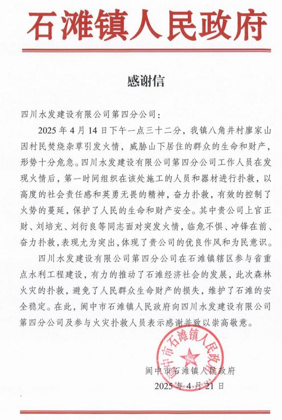 前不久,閬中市石灘鎮(zhèn)八角井村廖家山因村民焚燒雜草突發(fā)火情,火勢(shì)兇猛,迅速向民宅蔓延,情況萬分危急。建設(shè)公司四分公司青年突擊隊(duì)聞令而動(dòng),化身逆火而行的“鋼鐵戰(zhàn)士”,攜帶滅火器材奔赴火場。面對(duì)熊熊烈火,他們無畏無懼,手持鐵鍬、鋼鏟奮力清理可燃物,于上風(fēng)口處奮勇?lián)浯蛎骰?;針?duì)火勢(shì)較大區(qū)域,熟練使用滅火器進(jìn)行重點(diǎn)攻堅(jiān),并安排專人嚴(yán)密巡查,杜絕復(fù)燃隱患。在這場與時(shí)間賽跑、與烈火較量的戰(zhàn)斗中,青年突擊隊(duì)以專業(yè)的救援能力和頑強(qiáng)的拼搏精神,成功控制火情,為保障群眾生命財(cái)產(chǎn)安全筑起堅(jiān)實(shí)防線,用實(shí)際行動(dòng)詮釋了“水利鐵軍”不畏艱險(xiǎn)、沖鋒在前的奉獻(xiàn)擔(dān)當(dāng),贏得了閬中市石灘鎮(zhèn)人民政府的高度贊譽(yù)與真摯感謝。