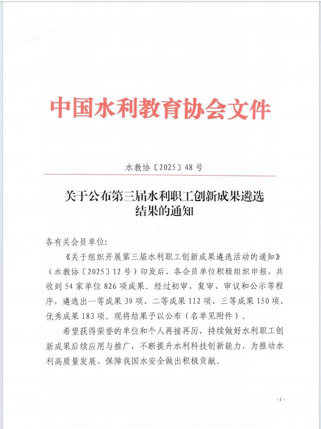 近日,中國水利教育協(xié)會(huì)公布了第三屆水利職工創(chuàng)新成果遴選結(jié)果。在本次活動(dòng)中,集團(tuán)高度重視,精心部署,立足水利工程建設(shè)與管理實(shí)際,積極開展技術(shù)創(chuàng)新和實(shí)踐探索,多項(xiàng)成果成功入選,取得優(yōu)異成績。